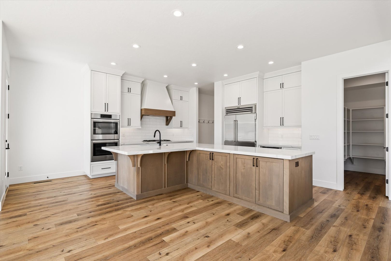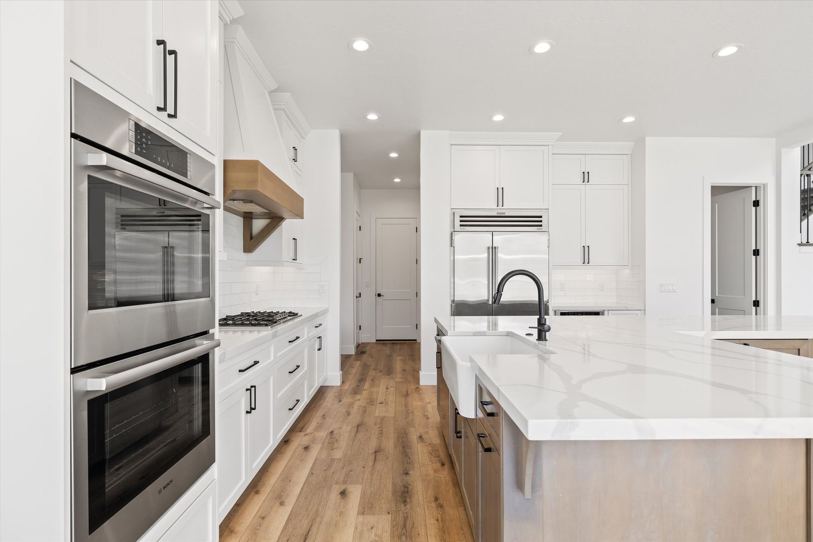 The heart of the home features an L-shaped kitchen island with both the cooktop and sink, complemented by Bosch appliances, granite countertops, and an enormous walk-in pantry. A dedicated grilling patio off the dining room makes outdoor cooking effortless, while the large covered back patio provides the perfect setting for relaxing or entertaining.