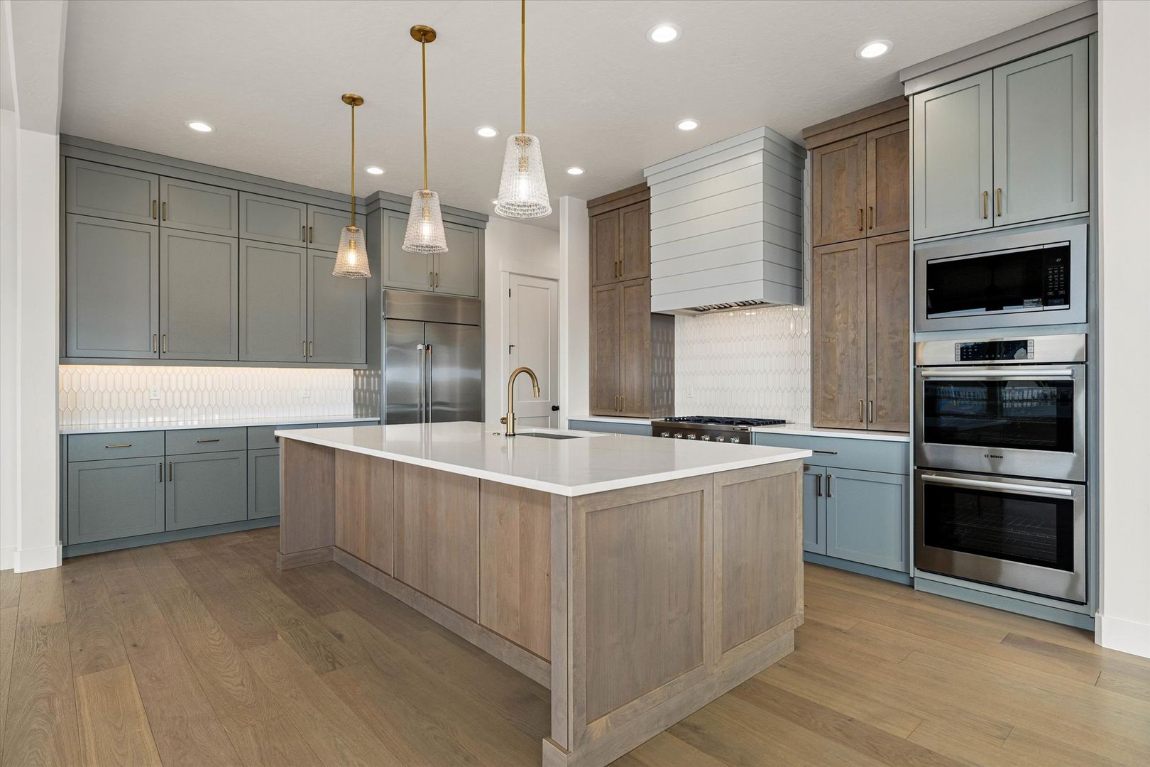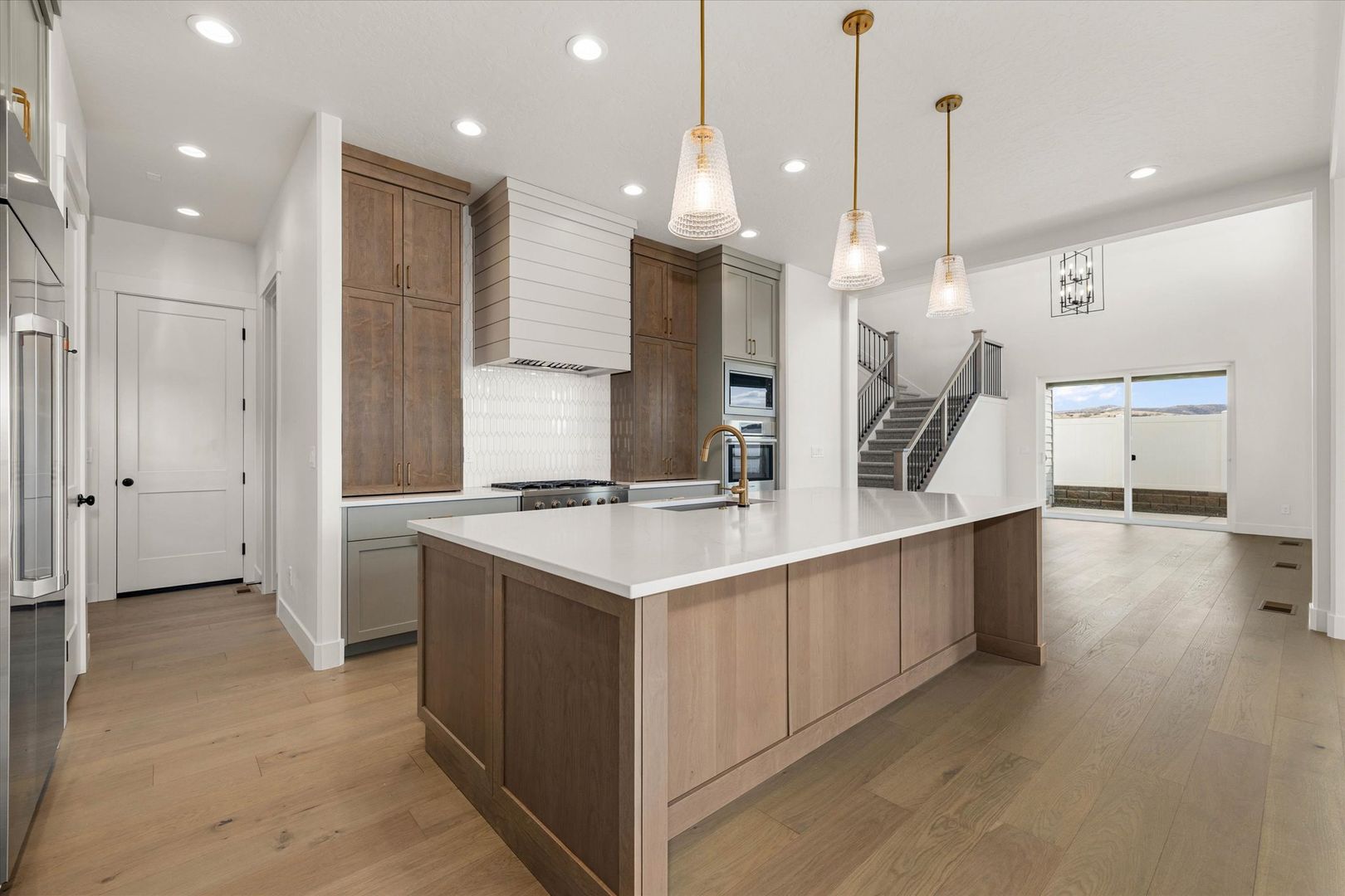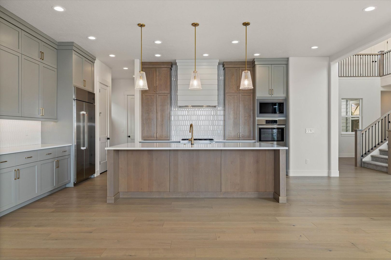 Thoughtfully designed with bold architectural elements, the home’s open-concept layout is anchored by a dramatic staircase framed by expansive windows that flood the interior with natural light. The chef’s kitchen features an oversized island that seamlessly connects to the spacious great room—perfect for refined entertaining or comfortable everyday living. A wraparound covered patio extends the living space outdoors, creating effortless indoor-outdoor flow ideal for Boise’s four-season climate.