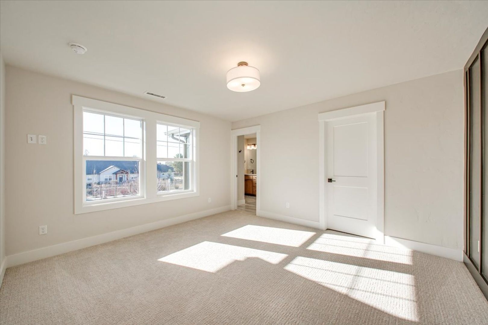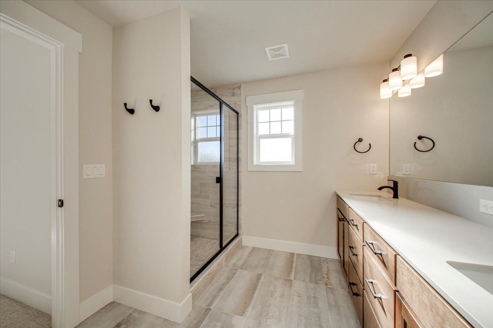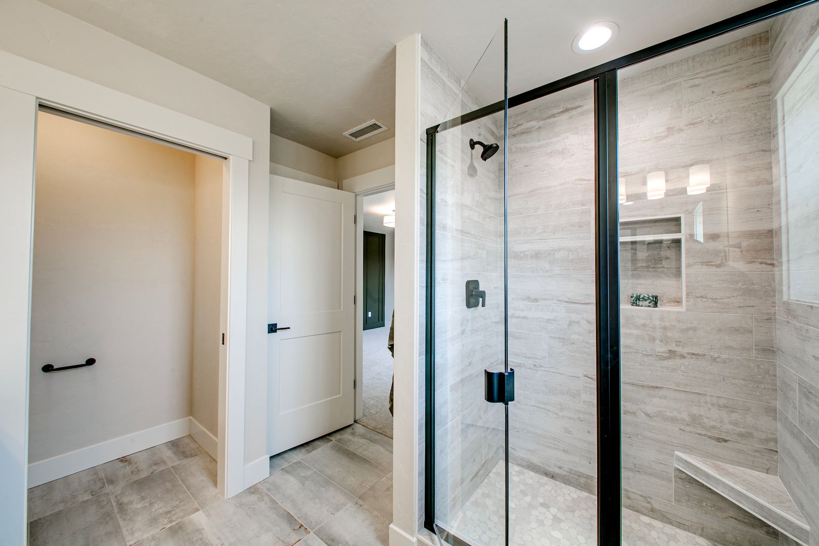 The main-level primary suite offers a serene retreat, complete with a spa-inspired en suite bathroom, dual vanities, floor-to-ceiling tile shower, and a spacious walk-in closet. Two additional bedrooms (including one on the main level) offer flexibility for guests, home office, or bonus room use.