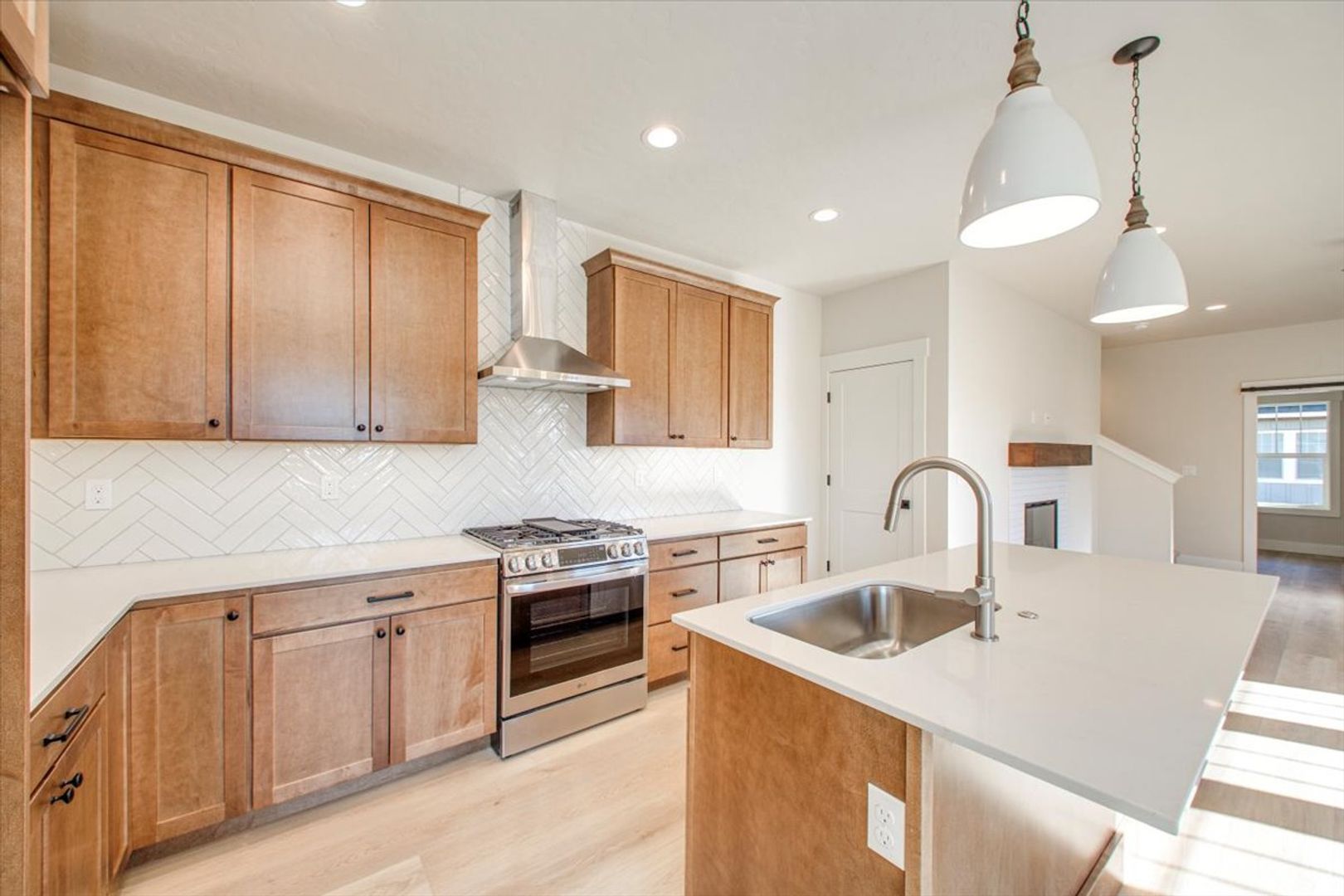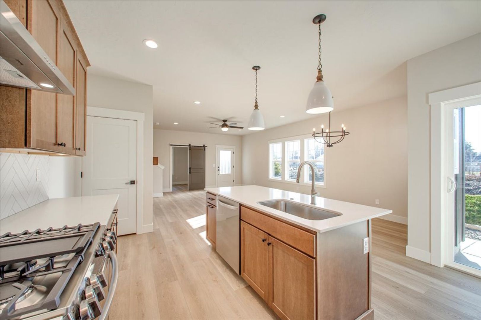 The gourmet kitchen features quartz countertops, stainless steel appliances, a full-height tile backsplash, and an oversized island perfect for entertaining. The living space flows seamlessly onto a covered patio with private views—ideal for morning coffee or relaxing evenings.